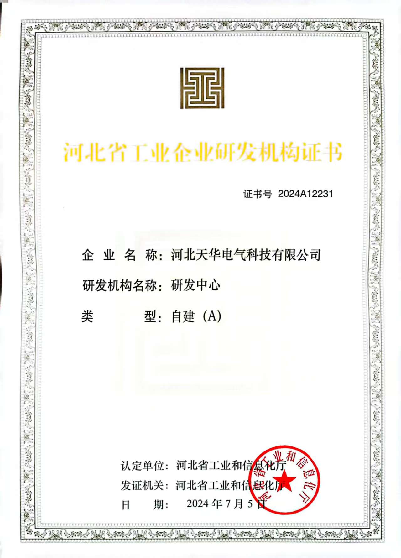 河北省工业企业研发机构证书A级